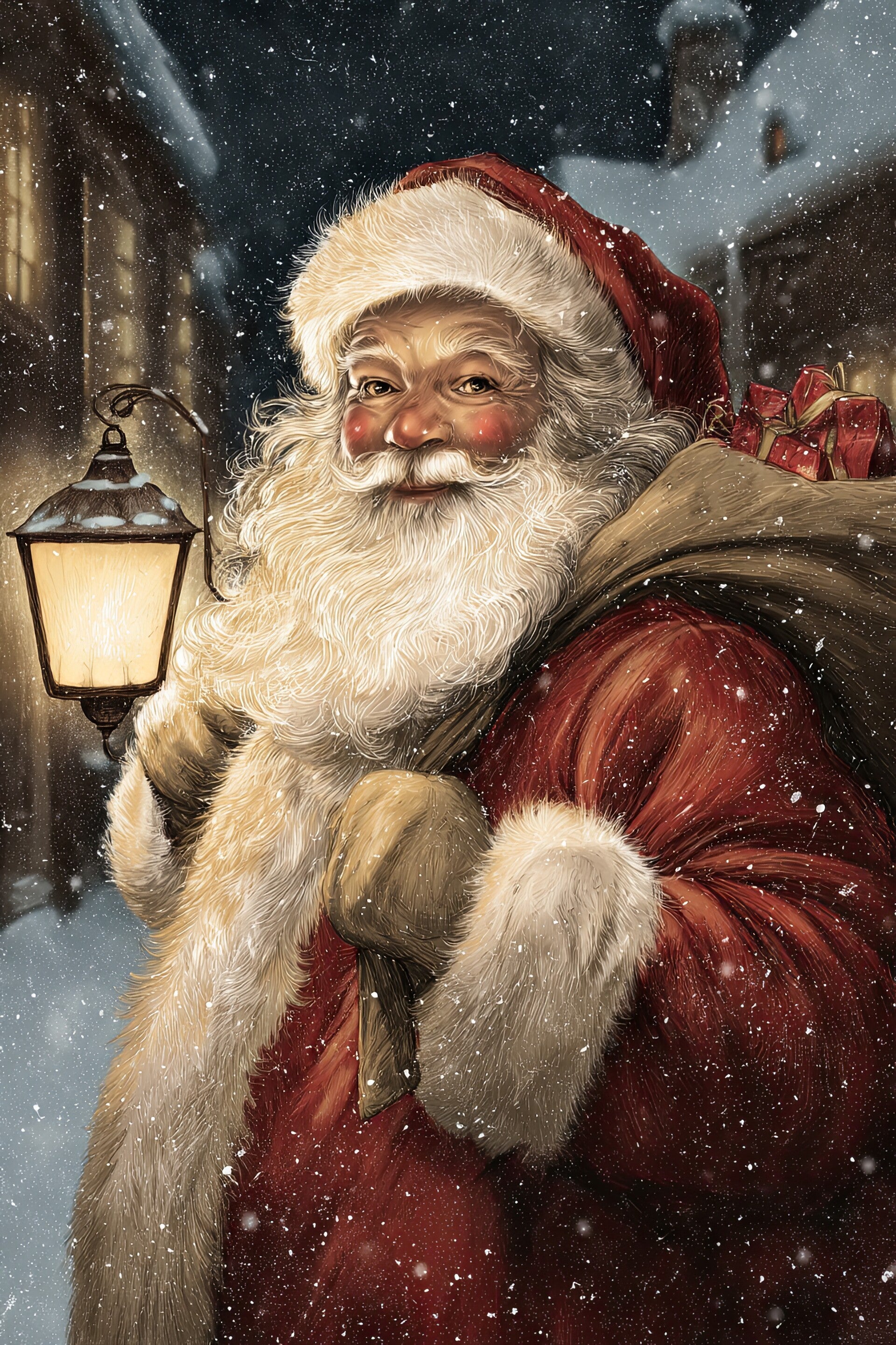 Stimmungsvolles POD-Motiv mit klassischem Weihnachtsmann im roten Mantel, Laterne in der Hand und voller Geschenke – ideal für Weihnachtsdesigns.