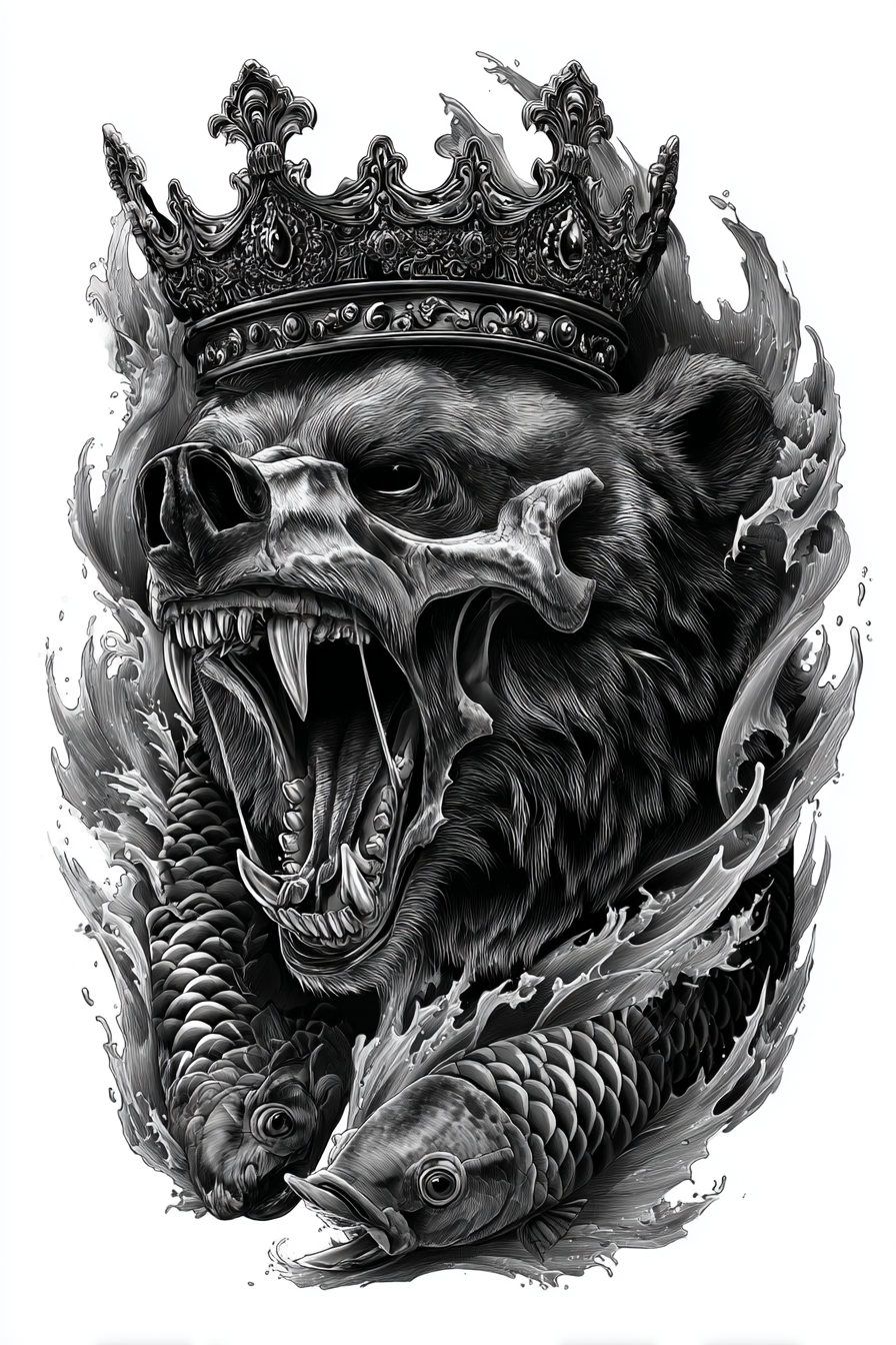 Kraftvolles POD-Motiv im Oldschool-Stil: Ein wilder Bär mit aufgerissenen Fängen, edler Krone und tobenden Wellen – perfekt für starke Designs.